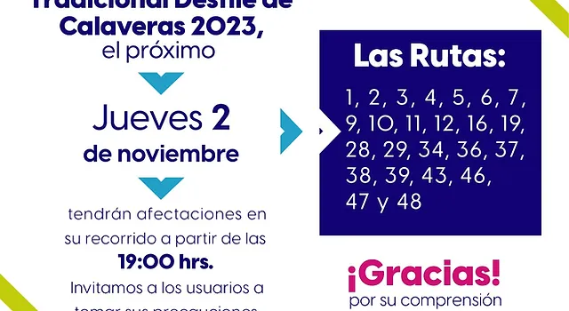La Coordinación General de Movilidad (CMOV) informa a los usuarios del transporte urbano que con motivo del Desfile de Calaveras que se llevará a cabo este jueves 2 de noviembre, 14 rutas tendrán modificaciones en sus recorridos a partir de las 19:00 horas.